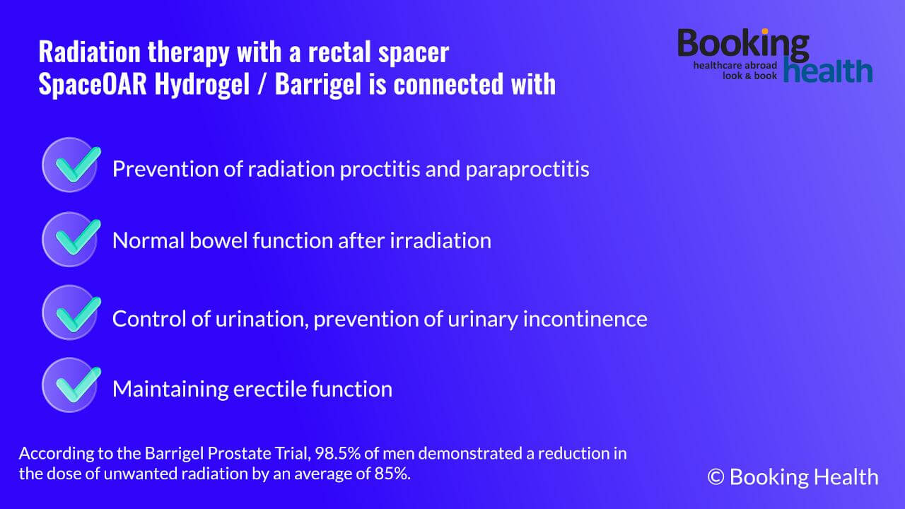 A radiation therapist is an important member of the medical team that treats prostate cancer. Due to the proximity of the prostate to the bladder, penis, and intestines, radiation therapy may cause complications such as urinary incontinence, erectile dysfunction, and post-radiation rectal and pelvic tissue inflammation (proctitis and paraproctitis). During treatment in Germany, doctors place a rectal spacer between the prostate and other organs, such as SpaceOAR Hydrogel or Barrigel, which reduces the risk of complications in 98.5% of men. A hydrogel spacer for prostate cancer represents one of the most significant advancements in radiation therapy, allowing doctors to deliver higher, more precise radiation doses while protecting surrounding tissues.