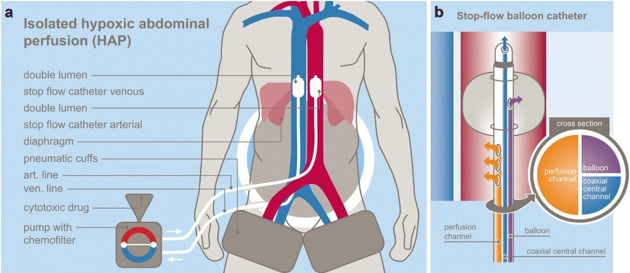 During the procedure interventional radiologists thread thin catheters through a small groin incision, navigating toward tumor-feeding arteries under imaging guidance. Three techniques target different patterns. Hypoxic abdominal stop-flow perfusion temporarily halts circulation to trap drugs where peritoneal metastases concentrate; upper abdominal perfusion isolates the gastric region; intraarterial infusion continuously feeds chemotherapy through tumor vessels. Blood filtration removes residual drugs within 45 minutes.