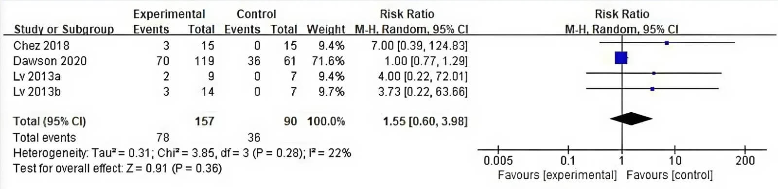 No significant difference in adverse event rates between stem cell therapy and control groups (RR = 1.55; 95% CI = 0.60 to 3.98; p = 0.36) was found in the systematic review and meta-analysis [1]. This additionally contributes to the favorable assessment of safety profile.