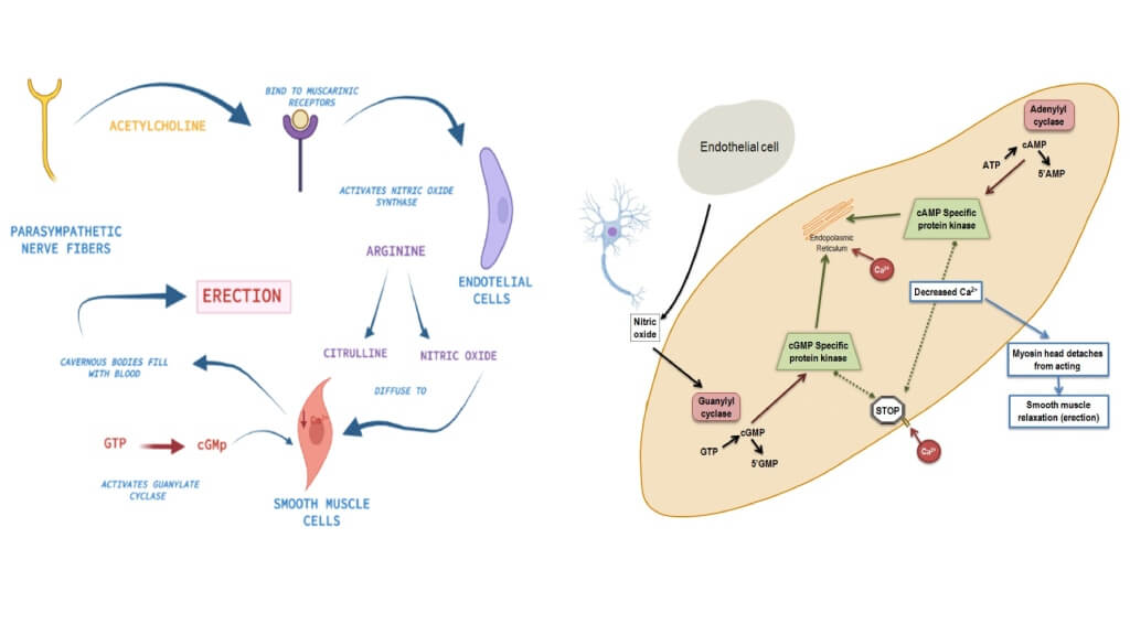 - Регуляция ключевых медиаторов – клетки помогают контролировать внутриклеточную концентрацию оксида азота и кальция: оба вещества необходимы для поддержания надлежащей эректильной функции за счет расслабления гладких мышц.